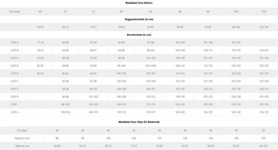 | Maat | 110A, 105B, 115C, 115A, 115B, 100A, 105A, 110B, 75A, 75B, 75C, 75D, 80A, 80B, 80C, 80D, 85A, 85B, 85C, 85D, 90A, 90C, 90D, 95B, 95C, 95D, 100C, 100D, 105C, 110C, 95A, 90B, 100B |