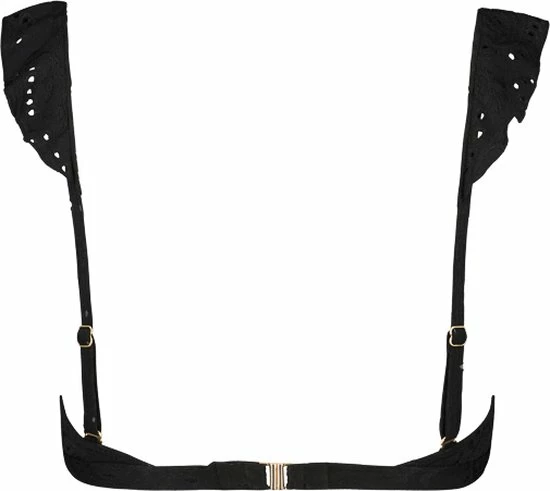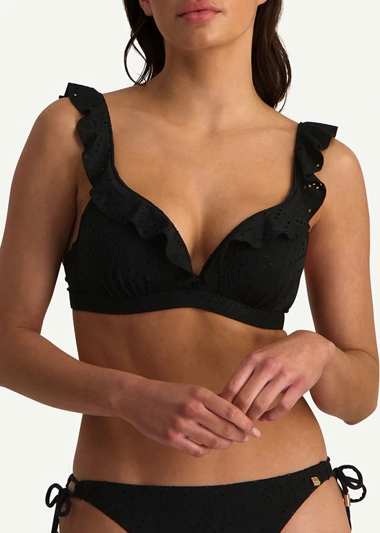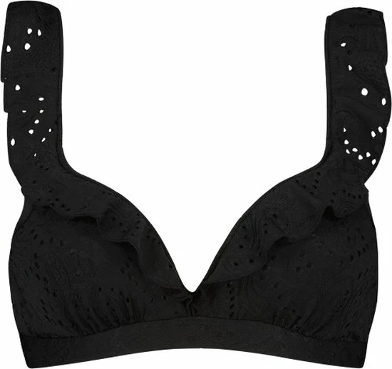 Beachlife Black Embroidery ruffle bikinitop met voorgevormde cups en beugel. De ruffles lopen van de schouderbandjes door over de cups. De top heeft verstelbare schouderbandjes en een metalen sluitclip op de rug.