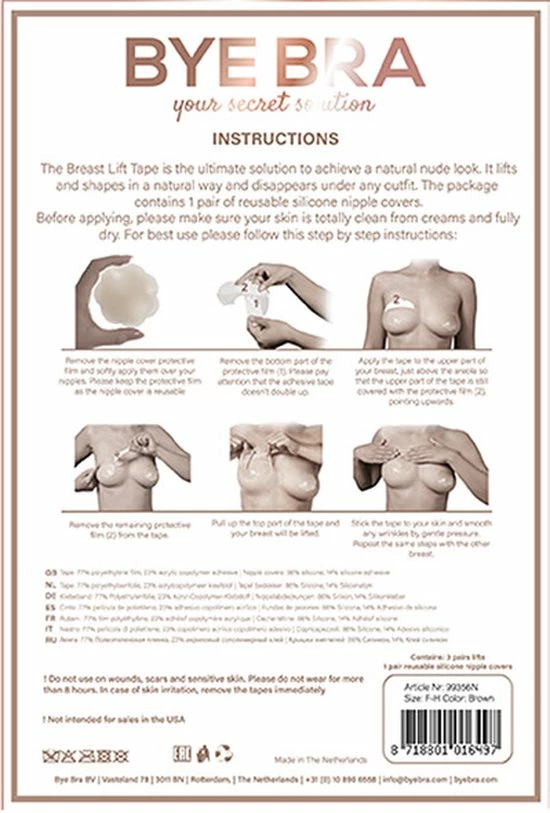 De Bye Bra strapless plak beha is dé oplossing om snel en efficiënt de borsten van een vrouw te liften, zonder dat er een BH of een operatie bij te pas komt. De Bye Bra strapless plak beha is heel dun en bevat een flexibel zelf plakkend folie. Hiermee is het mogelijk de tepels centimeters te liften of om de borsten te corrigeren. De 3M tape is veilig voor de borsten, wat wij niet kunnen onderstrepen bij Chinese kopieën die we hier en daar op de markt zien. Ook wanneer borsten verschillen in grote of vorm is de Bye Bra plak beha een uitkomst vanwege het corrigerende vermogen.