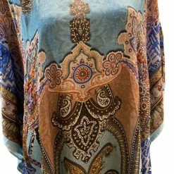 Merkloos Kaftan Met Steentjes Extra Lang Onesize 42-50 Turqoise/blauw/bruin