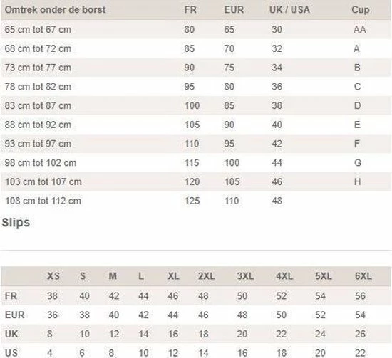 | Maat | 75B, 75C, 75D, 75F, 75G, 80B, 80C, 80D, 80F, 85B, 85C, 85D, 85E, 90B, 90C, 90D, 90E, 95B, 95C, 95D, 100B, 100C, 100D, 100E, 75E, 80E, 80G, 85F, 85G, 90F, 90G, 95E, 95F |