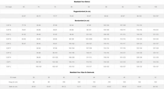 | Maat | 70C, 70D, 70E, 70F, 75B, 75C, 75D, 75E, 75F, 75G, 75H, 80B, 80C, 80D, 80E, 80F, 80G, 80H, 85B, 85C, 85D, 85E, 85F, 85G, 85H, 90B, 90C, 90D, 90E, 90G, 90H, 95B, 95C, 95D, 95E, 95F, 95G, 95H, 100B, 100C, 100D, 100E, 105C, 105D, 105E, 70G, 70H |