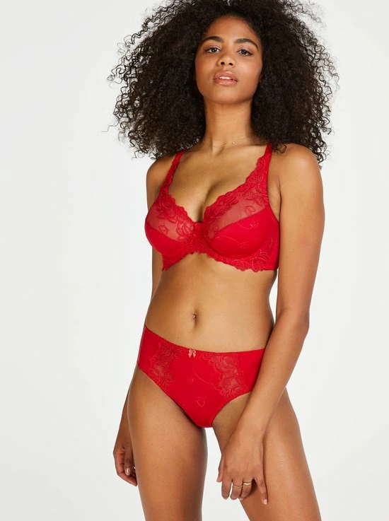 Deze niet-voorgevormde beugel bh is uitgevoerd in een ondoorzichtige stof en aan de bovenzijde afgewerkt met semi-transparant kant. De cups zijn versierd met een elegant bloemenpatroon. Maak je set compleet met de bijpassende Diva slip.