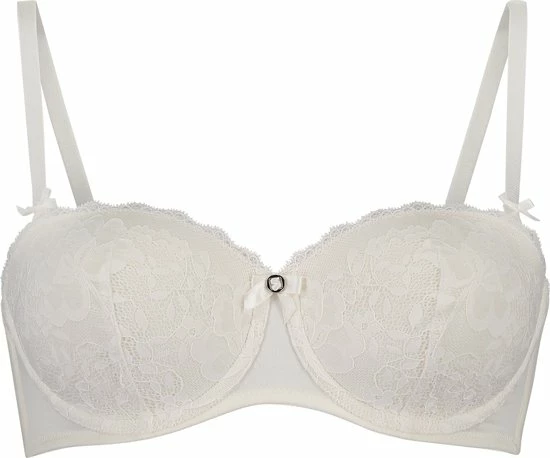 Deze voorgevormde beugel bh is uitgevoerd met kant op de cups. De schouderbandjes zijn afneembaar, waardoor de bh strapless te dragen is. Afgewerkt met een strikje tussen de cups.