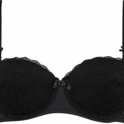 Deze voorgevormde beugel bh is uitgevoerd met kant op de cups. De schouderbandjes zijn afneembaar, waardoor de bh strapless te dragen is. Afgewerkt met een strikje tussen de cups.