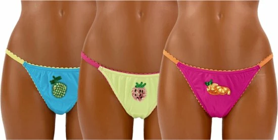 Set van 3 dames G-strings in geel, blauwe en roze kleur met fruit design. Deze dames strings trekken de aandacht met hun vrolijke aardbei, ananas en cirtrusvrucht afbeelding aan de voorkant van de string. De strings zijn one size en bestaan uit 100% polyamide. Deze worden geleverd als set van 3 strings.