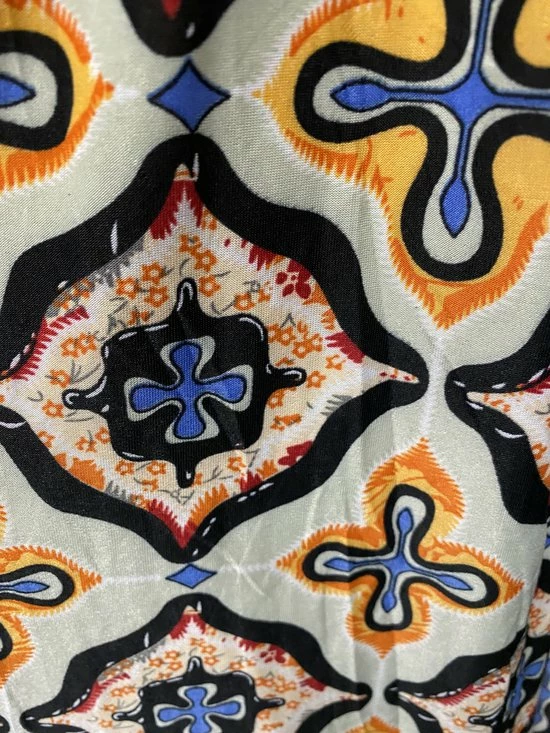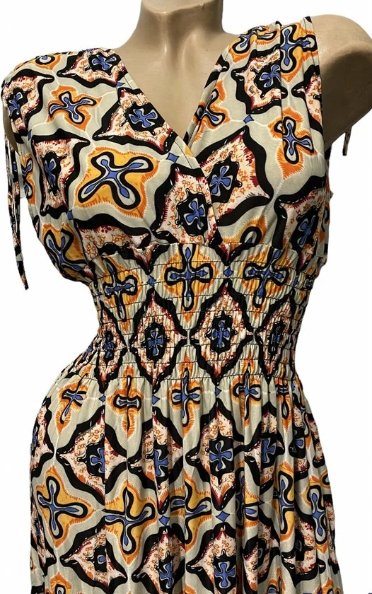 Mooi lang jurkje met print. De jurk heeft een v hals aan de voorkant en v aan de rugzijde. De jurk heeft aantrektouwtje op de schouders en de taille is getailleerd. Het jurkje draagt comfortabel en valt soepel. In de taille zit soepele elastiek waardoor de jurk door meerdere maten kan worden gedragen. Het materiaal is fijne en gladde stof van 100% viscose. De lengte van de jurk is circa 140cm lang. Wasbaar op 40 graden.