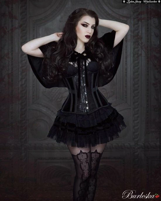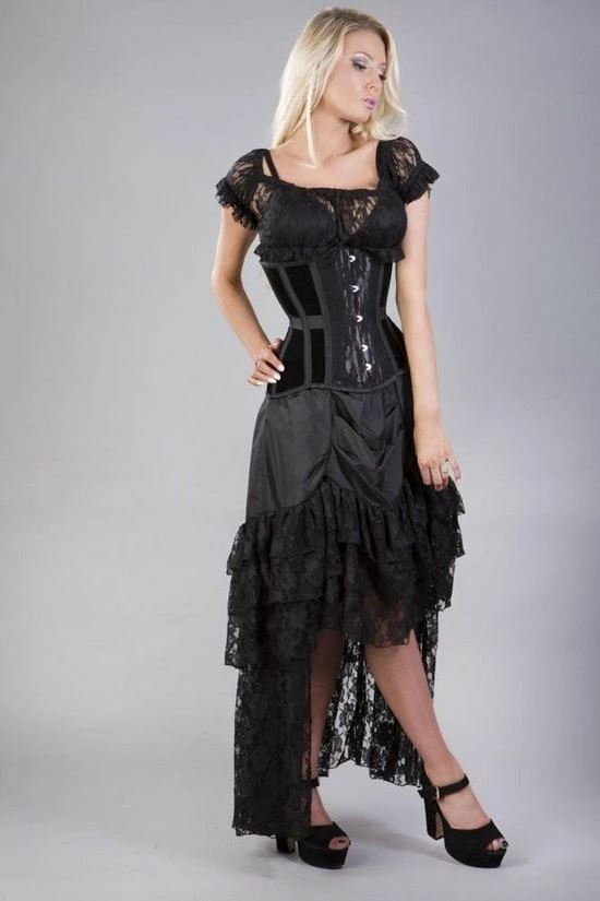 Morgana onderborst korset van het londonse merk burleska.Dit is een kwaliteit korset in gothic stijl met clip sluiting,kanten details en een verstelbaar (modesty) paneel achter met rijgveters.Dit schitterend gothic,burlesque korset is in zwart fluweel (flock) met zwart kanten details.Combineer met een maxi gothic stijl rok van het merk burleska voor de perfecte look.