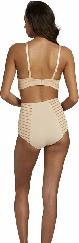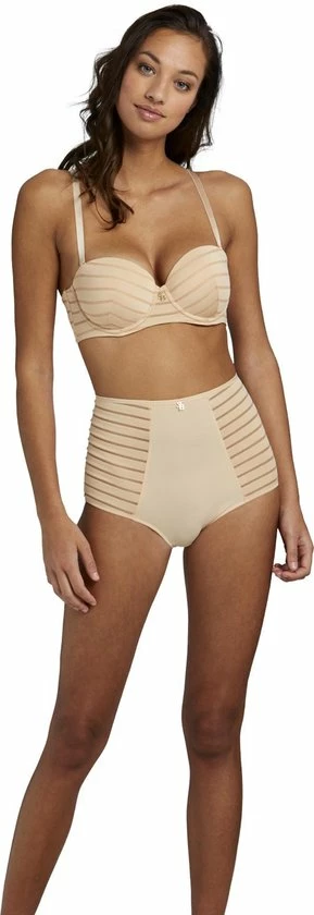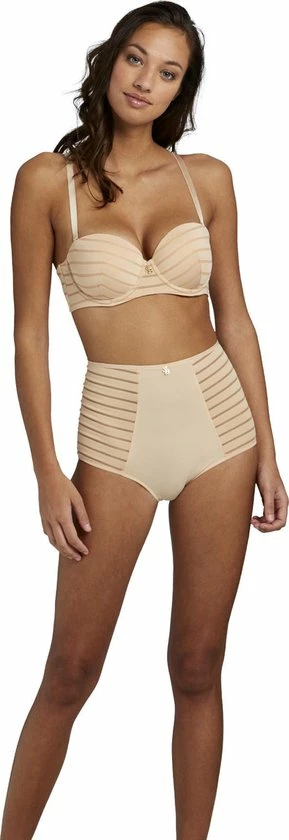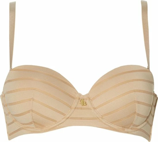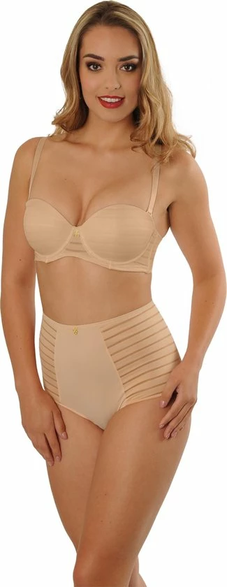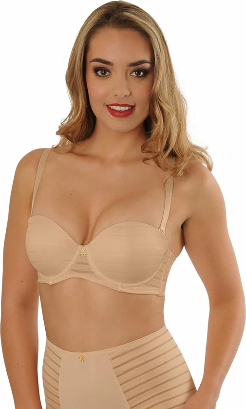 De strapless balconette bh is een bijzonder item. Deze nude gestreepte bh kun je met en zonder bandjes dragen. Er zit geen rubber of silicone in deze bh om irritatie van de huid te vermijden. De beugel van de bh is aangepast zodat de bh bij zo veel mogelijk vrouwen mooi en comfortabel zit.