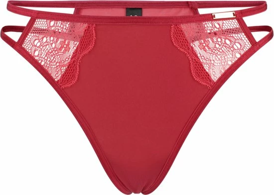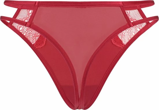 De Scarlet staat bekend om haar sensuele en verleidelijk look. Deze string heeft een rode kleur is gemaakt van verschillende materialen. Zo is de voorkant gemaakt van microfiber met randen die zijn afgewerkt met kant. De zijkanten van de string hebben twee straps en zijn open, wat zorgt voor een sensuele feel. De achterkant van de string is van mesh gemaakt. Wist je dat? De Scarlet string compleet te maken is met de bijpassende Scarlet beugel BH en/of Scarlet balcony BH. Ons model is 175cm en draagt maat M.