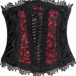 Sinister. Gothic underbust with satin ribbon lacing through metal eyelets.The waist accentuating waspie has front and back satin panels with Sicilian lace overlay which are trimmed with brocade lace trimming at either side of the panels. At the centre back, the triangle – shaped panel is decorated with a rich satin ribbon lacing through looped trimming. The fully lined underbust is decorated with black satin rosebuds and has flexible plastic boning. The lacing can be worn at the front as well as at the back.